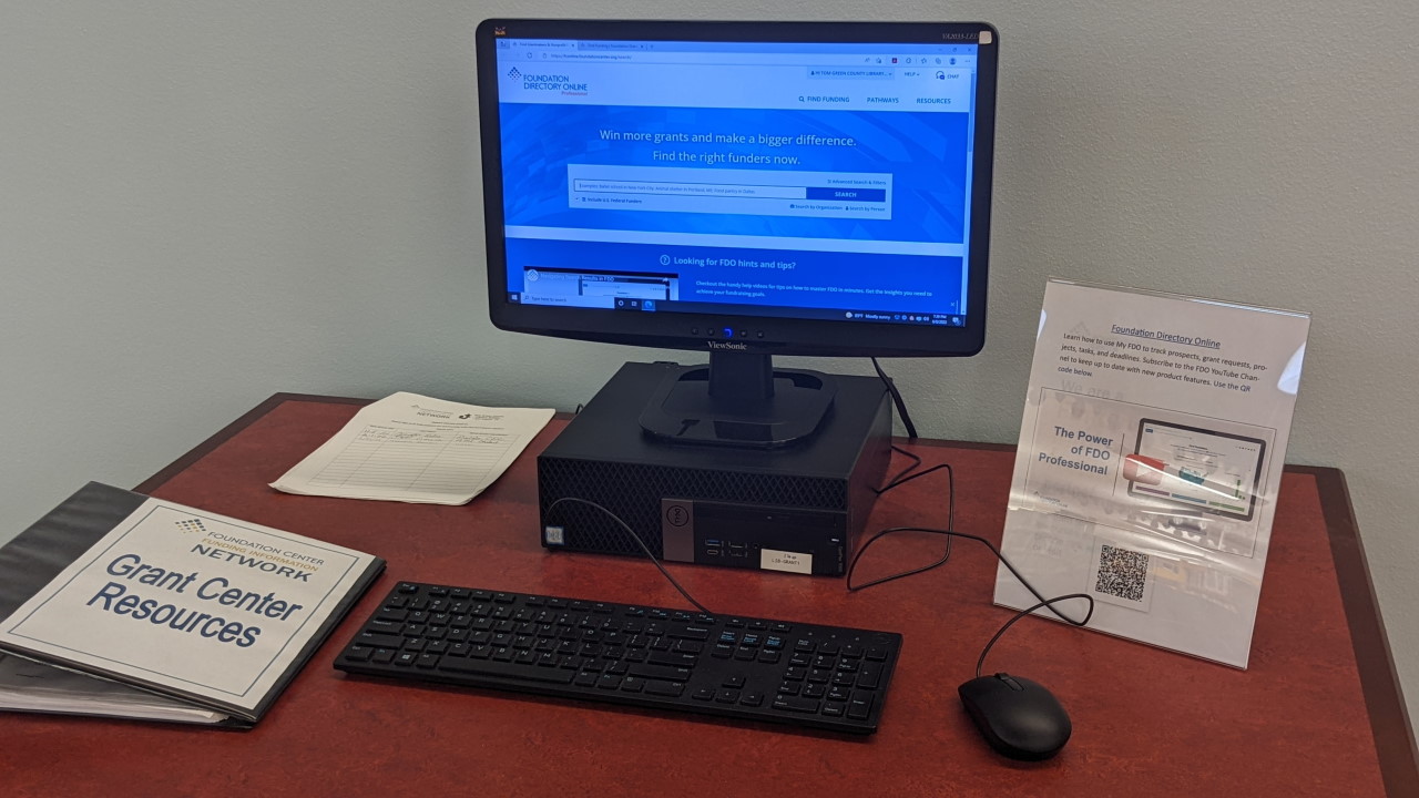 In addition to the computer, a Grant Center Resources binder is available to aid with searching for grants.